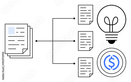 Stack of documents connected to separate pages leading to a lightbulb and coin with a dollar sign. Ideal for workflow, creativity, finance, productivity, innovation, organization, flat simple