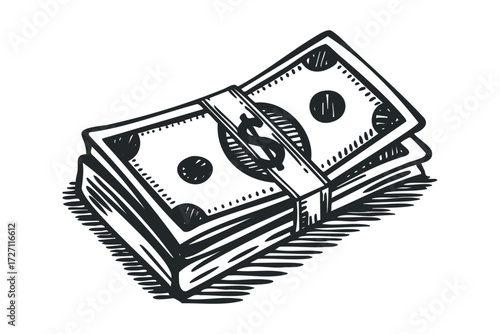 Stack of Dollar Bills Tied Together. Vector hand drawn illustration