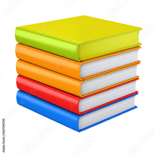 Stack of five hardcover books with vibrant covers in yellow, green, orange, red, and blue, neatly piled with visible white pages and smooth edges
