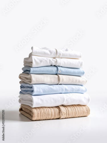 organisation, tidiness, laundry, shirt, sweater, fashion, minimalism, white background, clothing, textile, cotton, clothes rack, storage, neat, clean, order, pile, domestic life, housekeeping, fabric, soft, cosy, comfortable, blue, white, beige, simplicity, tidying up, garment, buttons, texture, stack