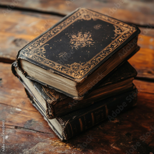 Stack of Vintage Ornate Books on Wooden Table