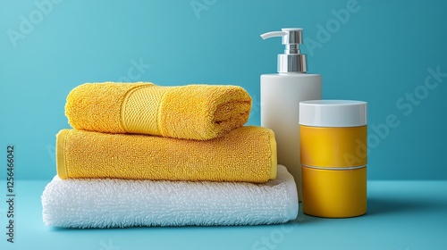 Stack of White & Yellow Towels with Bathroom Products on Light Blue Background – Beauty & Care Concept