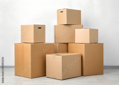 Stacked Cardboard Boxes for Moving or Shipping on Neutral Background