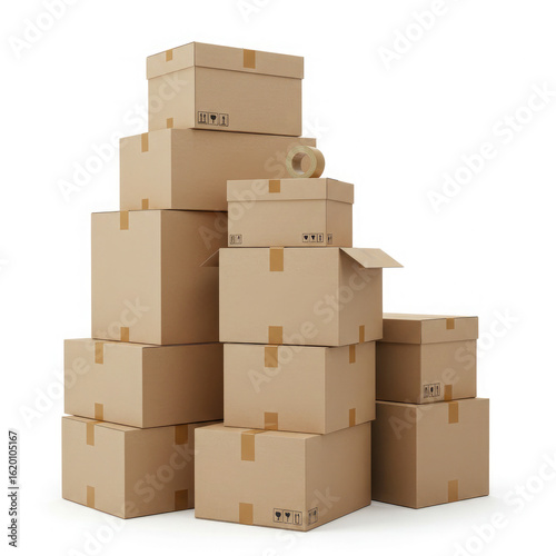 Stacked Cardboard Boxes for Shipping and Storage on White Background