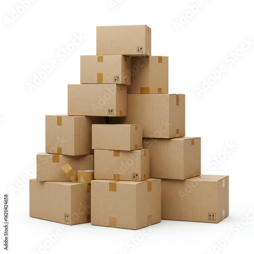 Stacked Cardboard Boxes for Shipping and Storage on White Background