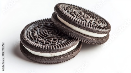 Stacked Chocolate Cookies with Cream Filling Close Up on White Background