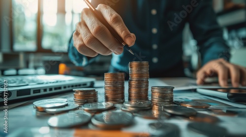coin, stack, savings, finance, investment, desk, calculation, economy, wealth, money, currency, financial, business, growth, accounting, banking, closeup, value, income, success