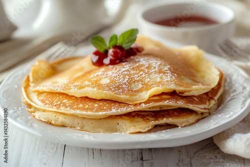 Stacked Pancakes Sprinkled With Powdered Sugar, Topped With Cherries and Mint