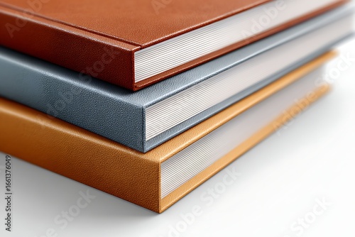 Stacked Textured Leather Bound Books in Brown, Gray, and Gold Colors on White Background