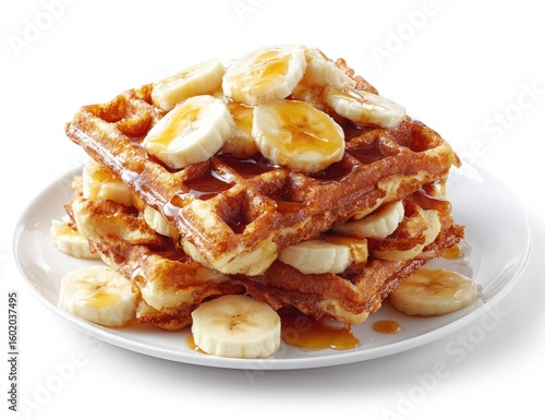 waffle, banana, honey, sirup, sweet, breakfast, dessert, food, stacked, plate, white, delicious, gold, crispy, baked, fresh, slice, fruit, honeyed, buttery, carb, food photography, closeup, isolated, tasty, deliciously, simple, comfort food