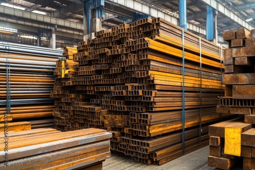 Stacks of steel beams and coils in a vast warehouse, metallic reflections, Heavy industry materials heavy-duty