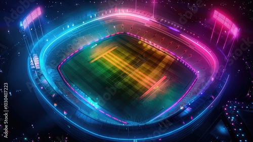 Stadaunton rectangular cricket stadium, lights on the stands and field, view from above, bright colors,