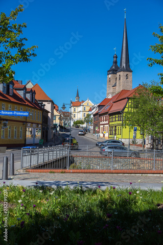 Stadt Burg in Sachsen-Anhalt, Deutschland, Europa mit mittelalterlicher Gasse und farbigen Fassaden