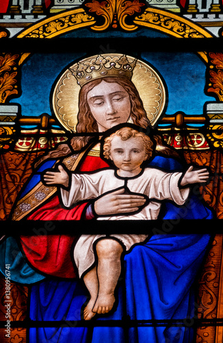 Stained glass (19th century) of Blessed Virgin Mary holding baby Jesus Christ in her arms.
