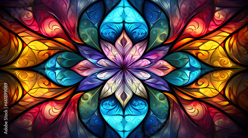 Stained glass abstract background. Fractal flower pattern in vibrant colors. Kaleidoscope art. Digital fractal design. Flower pattern in abstract stained glass. Symmetry design.