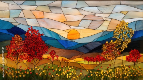 Stained glass artwork depicting a sunset over mountains with colorful autumn trees and a vibrant landscape