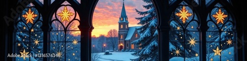 Stained glass window with snowflakes and church stars at dusk, church, snow