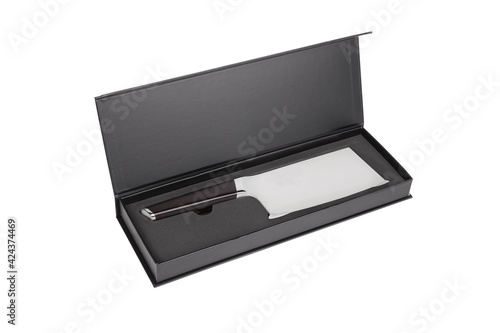Stainless steel butcher's knife on black box. Meat cleaver knife.