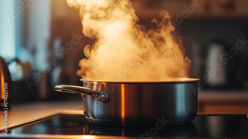 stainless, steel, pot, steam, kitchen, counter, orange, cooking, warm, light, cosy, boiling, home, appliance, utensil, modern, domestic, interior, food, preparation, hot, stove, cookware, metal, handle, lid, culinary, dinner, lunch, breakfast, meal, clean, shiny, heat, vapour, household, equipment, healthy, lifestyle, fresh, contemporary, simmer, aroma, inviting