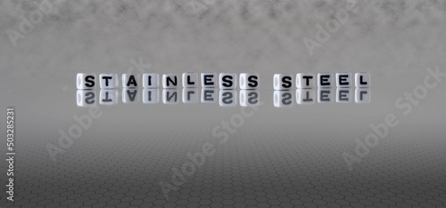 stainless steel word or concept represented by black and white letter cubes on a grey horizon background stretching to infinity