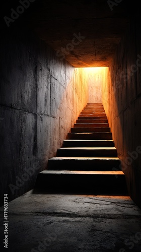 staircase, step, concrete, light, shadow, tunnel, passage, interior, illumination, darkness, grey, gold, warm, upward, perspective, underground, structure, building, architecture, urban, stair, design, composition, photo, industrial, empty, dark, interior design, depth, texture, copy space, lighting, photographic