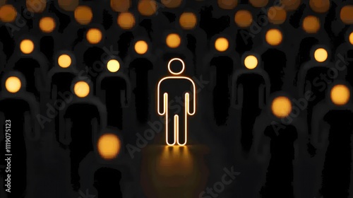 person, light, glow, background, crowd, silhouette, standing, unique, representation, individuality, darkness, contrast, art, abstract, human, isolation, concept, design, visual, illustration, attention, highlight, single, vibe, mystery, presence, figure, shape, environment, sharpened, illumination, pattern, graphic, identity, expression, symbol, perception, emotion, oneness, style