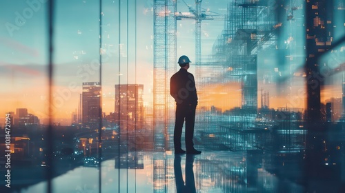 Standing construction engineer manager in a multi-exposure with background in building construction industry