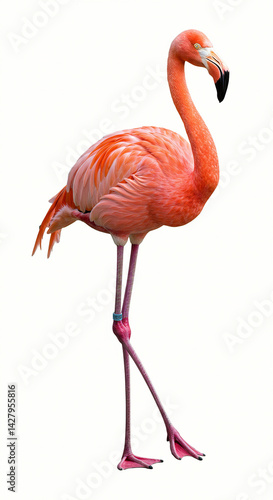 flamingo, bird, standing, isolated, white, background, pink, plumage, 1, leg, animal, wildlife, fauna, tropical, long, neck, avian, zoo, exotic, nature, wild, feather, colours, outdoors, vertebrate, close, ring, banding, tall, posing, watching, looking, closeup, studio, portrait, full, length, ornithology, specimen, species, elegant, filtered, filter, ornate