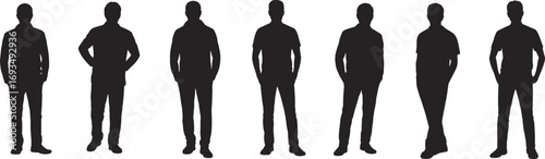 Standing male silhouettes, casual man poses, black vector figures, posture icon set, body language illustration, modern fashion stance, flat vector illustration