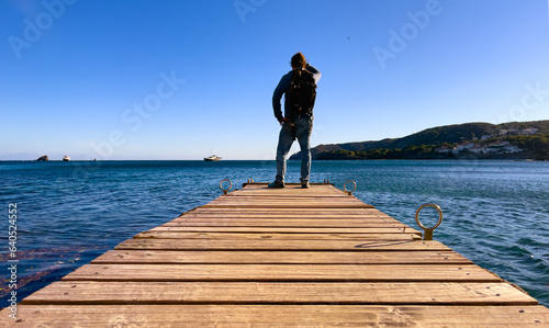 man, pier, mindfulness, standing, sea, lake, wooden, looking, admiring, person, calm, male, travel, vacation, horizon, peaceful, ocean, alone, thinking, footbridge, concept, freedom, carefree, lonely