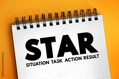 STAR acronym (Situation, Task, Action, Result) format is a technique used by interviewers to gather all the relevant information, concept on notepad
