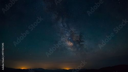 star and galaxy night sky, with lights shining behind the mountains in the background