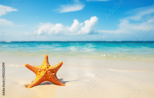 Starfish on Sandy Beach with Calm Turquoise Ocean and Lush Blue Sky in Background, Perfect for Tropical Vacation or Nature Themes