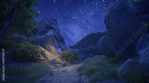 Starlit Night Path: A Serene Journey Through Rocky Terrain Under a Beautiful Sky