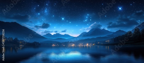 night, lake, mountain, village, starry, sky, cloud, scenic, landscape, beautiful, serene, tranquil, nature, travel, wallpaper, illustration, digital, fantasy, picturesque, calmness, peaceful, amazing, charming, idylli, romantic, breathtaking, quiet, misty, glowing, vibrant, cosmos, universe, moonlit, bergsee