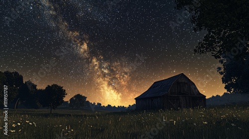 Starry Night Sky over Rustic Barn Peaceful Rural Landscape