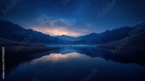 Starry night sky reflects on tranquil lake surrounded by hills