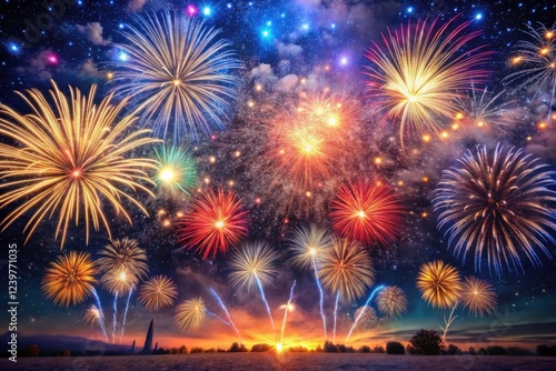 Starry sky canvas bursts with vibrant fireworks, a panoramic festive night celebration.