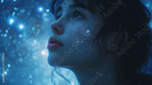star, starry, galaxy, galaxy, cosmic, outer, space, night, sky, sky, heaven, awe, amazement, fantasy, constellations, astronomy, astrology, woman, face, beauty, profile, eye, lip, model, make-up, person, head, people, make-up, closeup, skin, eye, children, nose, closeup, art, glamour, dark, blue