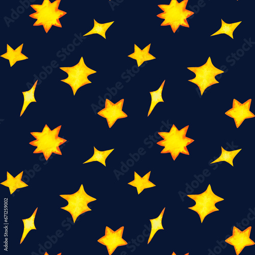 Stars seamless pattern. Hand drawn watercolor illustration isolated on black. Background for website, banner, card. Wrapping paper, birthday decor.
