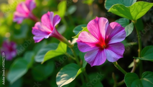 Star-shaped flowers of Ipomoea tricolor morning glory on a vine, flowering plant, foliage