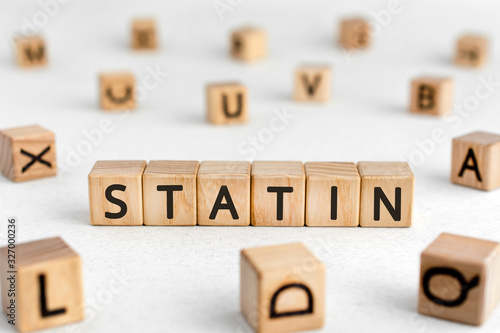 Statin - words from wooden blocks with letters, cholesterol level reduces drugs statin concept, white background
