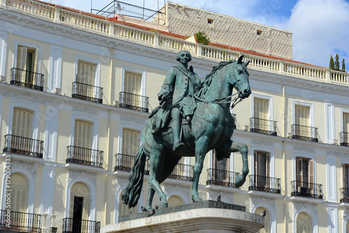 Statue of Carlos III at Puerta del Sol Gateway of the Sun, Madrid, Spain. Carlos III Charles III was the King of Spain from 1759 to 1788.