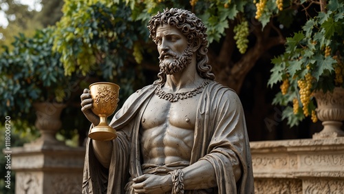 Statue of Dionysus, the god of wine, draped in a cloak of woven grapevines, holding a golden cup filled with wine, with a backdrop of celebratory feasts and dancing, carvings reflecting his spirit of