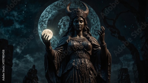 Statue of Hecate, the goddess of dark magic, holding a moon and ancient runes in both hands, with a backdrop of the dark night and mystical light, with carvings depicting her magic and power in the da