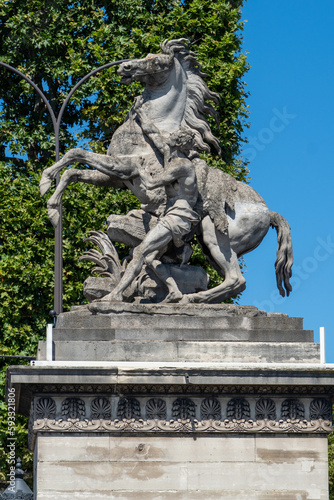 Statue of horse and man struggling in Paris, France.