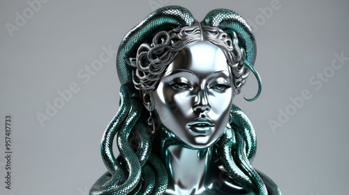 statue, woman, snake, coiled, head, power, strength, stoic, expression, holding, unique, artistic, interpretation, symbol, sculpture, female, strong, snake, creative, art, mythology, mythical, goddess, greek, roman, deity, bronze, ancient, myth, elegant, posture, dynamic, iconic, vintage, classical, symbolize, leadership, historical, artistry, masterpiece, form, symbolism, intriguing