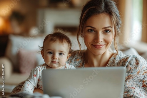 Stay at home mom working remotely on laptop while taking care of her baby, Generative AI