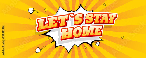 Stay home. Lettering in comic style with expressive text. Vintage pop art poster on yellow dotted background. Cartoon explosion comic speech bubble on background with rays. Vector illustration