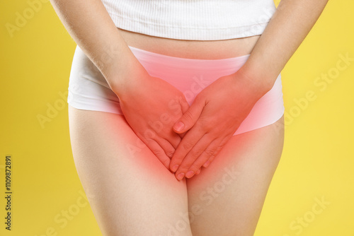 STD (sexually transmitted diseases). Woman holding hands near her groin on yellow background, closeup